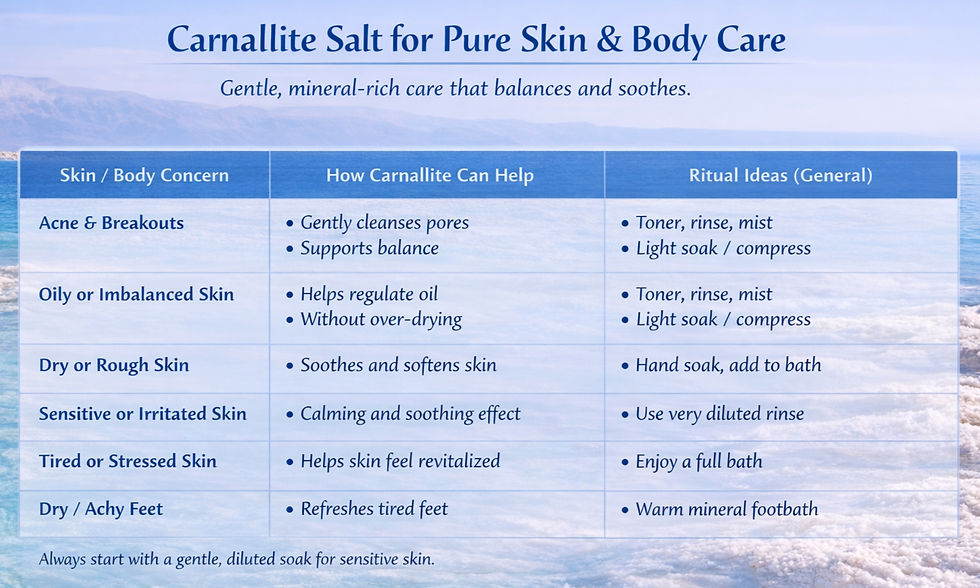 Unlike chemical detoxes, the benefits come primarily from minerals, circulation, and osmosis. What makes Carnallite Salt truly unique is that it is naturally low in sodium chloride (table salt), so it won’t dry out your skin like regular salt while still delivering rich minerals. Here’s how it works: